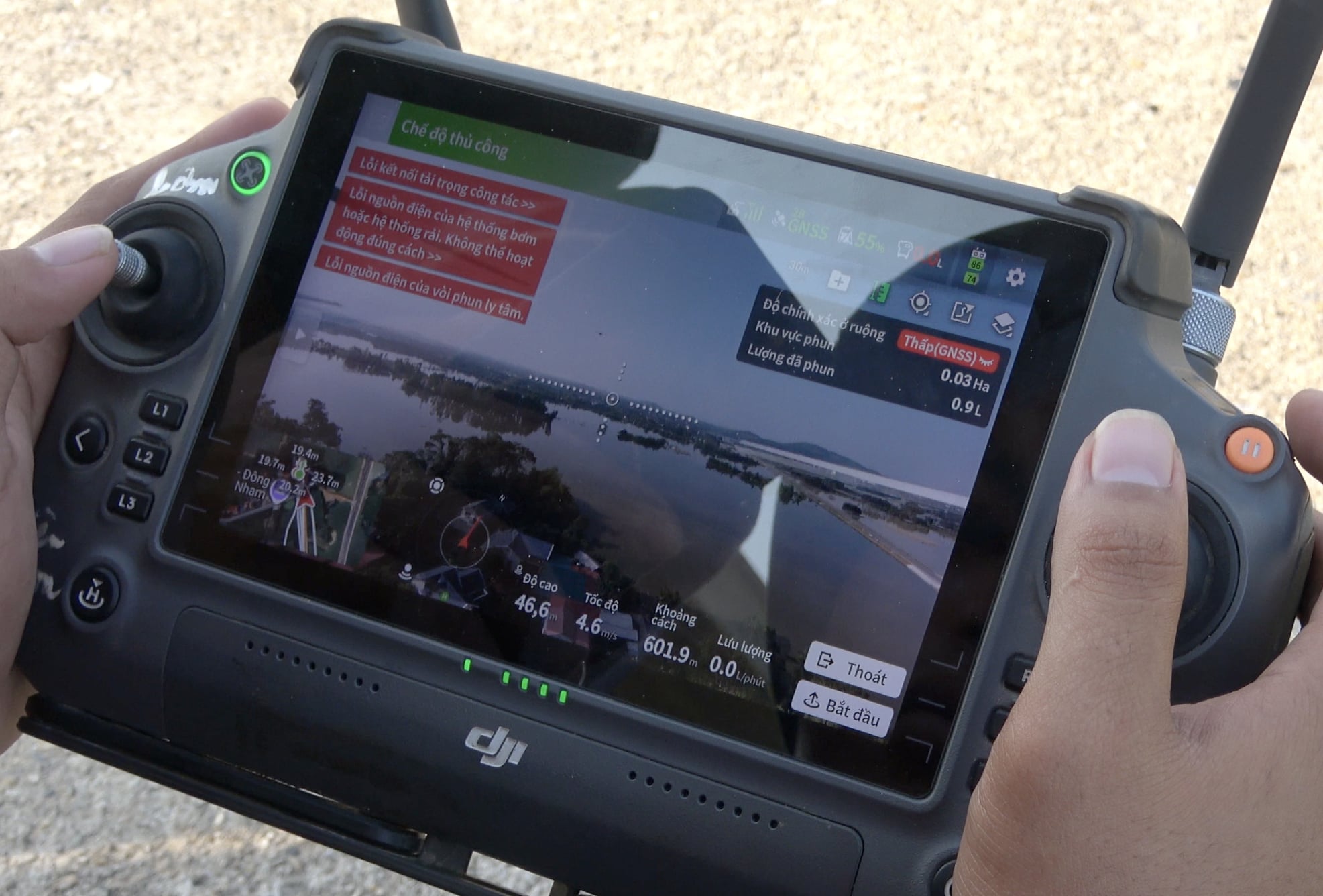Chọn được điểm mặt đê, mỗi người một tay, hai drone T50 được chuẩn bị bay. Mỗi drone nặng 40kg, pin nặng 12kg, tải được 40-50kg hàng. Đường bay được thiết lập, đường kính khoảng 2km. Máy phát điện được bật suốt để kịp nạp pin. Mỗi drone thường bay hai vòng phải thay pin. Người lắp pin phải luôn sẵn sàng.