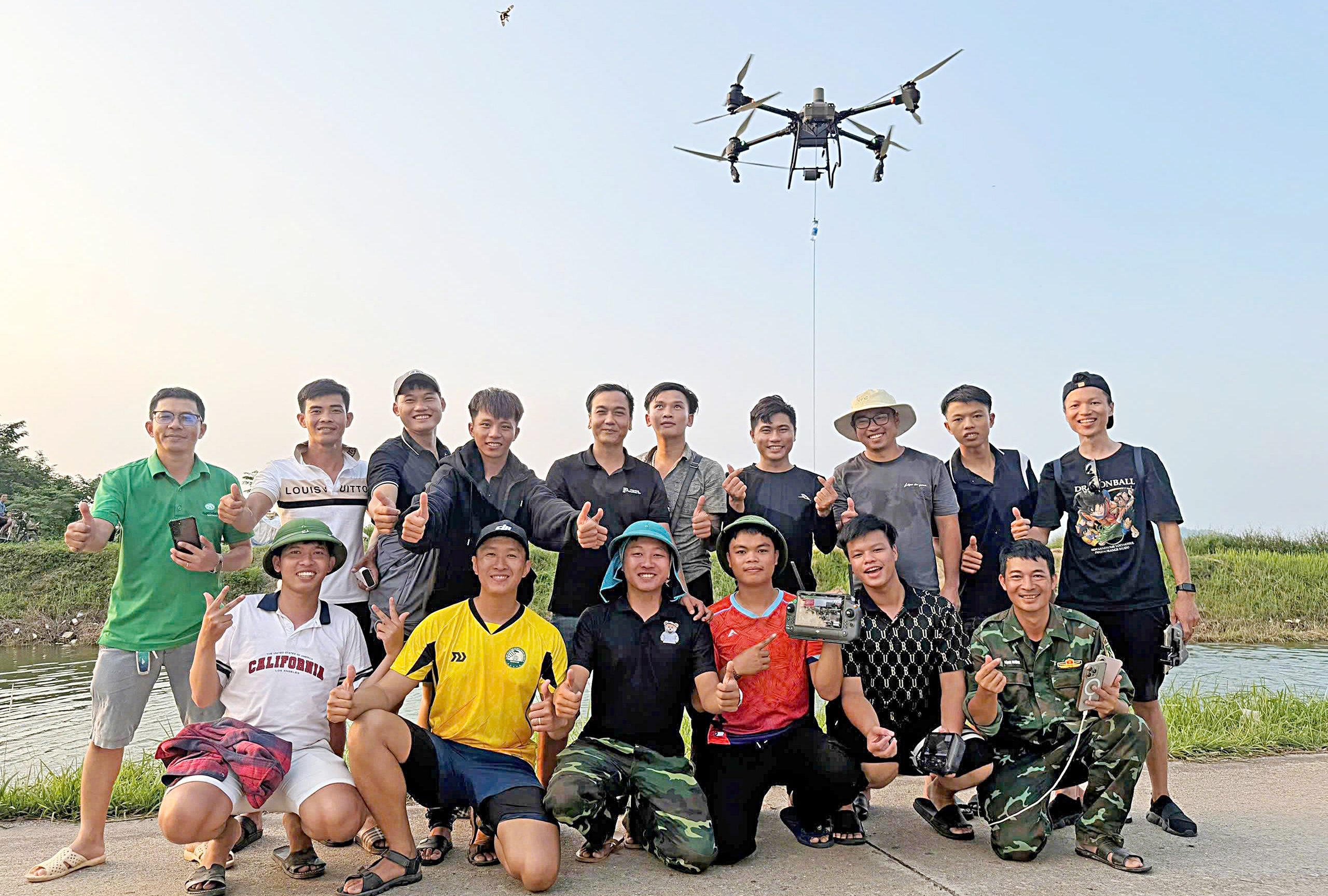 Các “phi công” điều khiển drone bay vào tâm lũ giúp bà con – Ảnh: TÂM LÊ